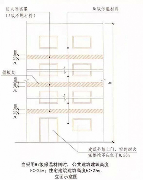 4.當建筑的外墻外保溫系統(tǒng)采用燃燒性能為B1、B2級的保溫材料時,除采用B1級保溫材料且建筑高度不大于24米的公共建筑或采用B1級保溫材料且建筑高度不大于27米的住宅建筑外,建筑外墻上門、窗的耐火完整性不應低于0.5小時。