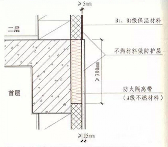 5.在保溫系統(tǒng)中每層應設置高度不小于300毫米且燃燒性能為A級的水平防火隔離帶。防護層厚度首層不應小于15毫米,其它層不應小于5毫米。