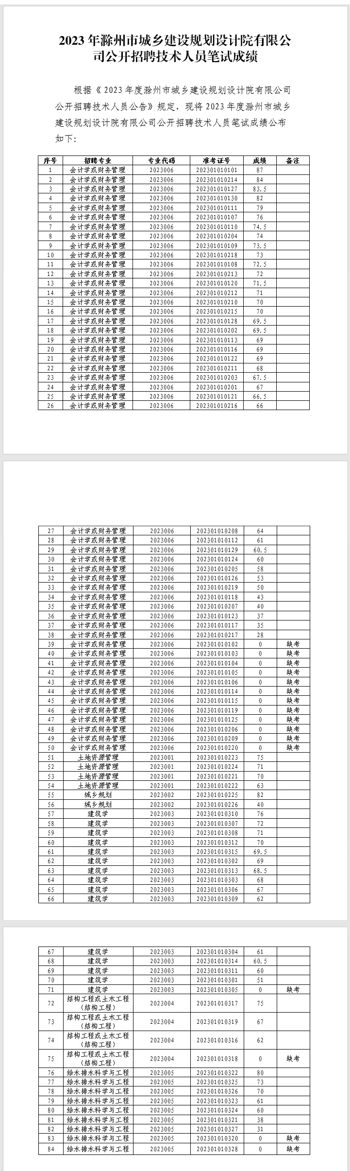 2023年滁州市城鄉(xiāng)建設(shè)規(guī)劃設(shè)計院有限公司公開招聘技術(shù)人員筆試成績